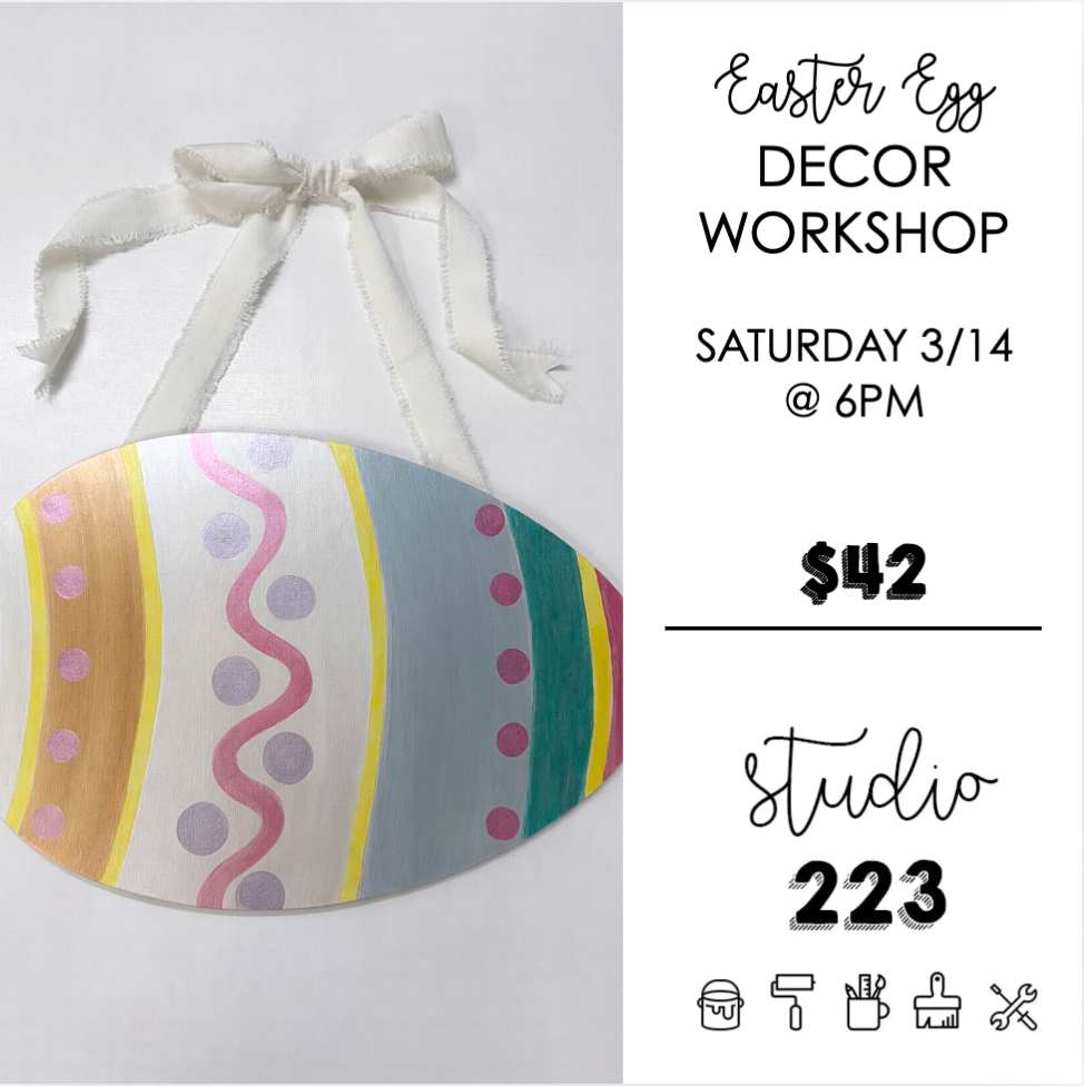 Get creative this spring at our Easter Egg Decor Workshop! In this relaxed, DIY workshop, you will free paint a large, 12 x 18", wooden egg using a variety of paints, patterns and simple design techniques. Whether you love soft pastels, bold colors or classic Easter designs, you'll create an egg that will perfectly match your spring decor! We will provide all of your supplies and an instructor, all you need to do is have a good time in the studio!
